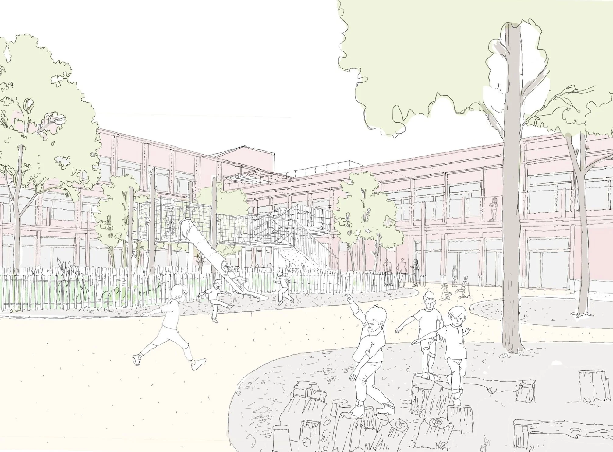 La parcelle de l’école étant restreinte, nous proposons un bâtiment très compact qui maximise les espaces de récréation. L’idée est de donner à lire une école intégrée dans un parc, avec des cours oasis et un TEP mutualisé noyé dans la végétation.